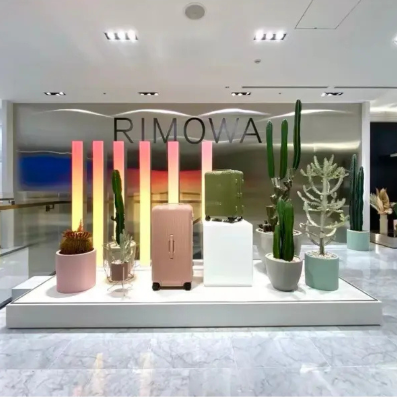Complementing the backdrop are assorted matte-finished acrylic podiums in pastel tones. These durable, lightweight cylinders offer a versatile solution for creating multi-level displays, perfect for showcasing varying product sizes from luggage to accessories.