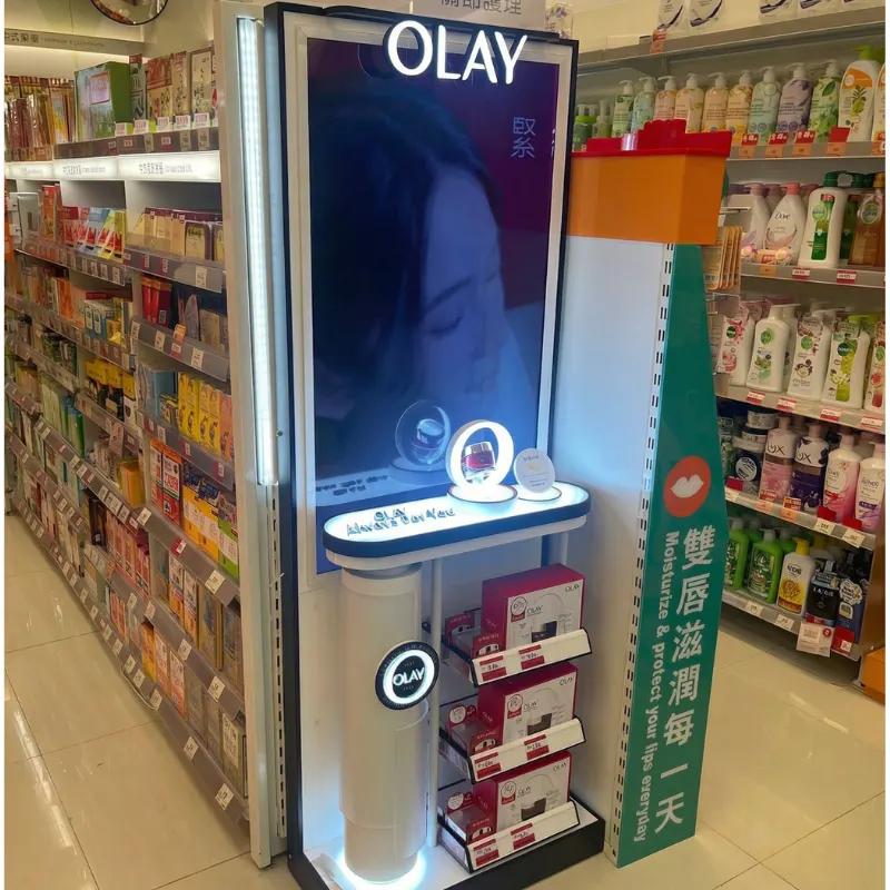 Combining a sleek white cylindrical pillar with a 3D illuminated top logo, the structure exudes clinical purity and modern elegance, perfectly aligning with the scientific identity of skincare brands like OLAY.