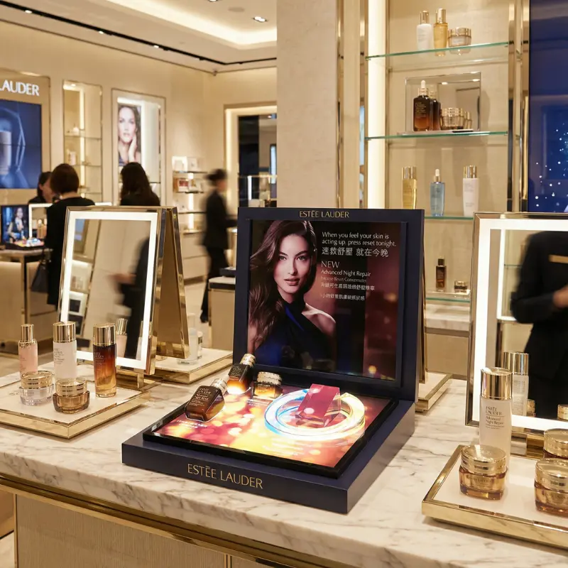 Showcase your products with the elegance and sophistication they deserve. This custom-crafted Estée Lauder display stand is a premier example of how innovative design and premium materials can converge to create a captivating point-of-sale experience.